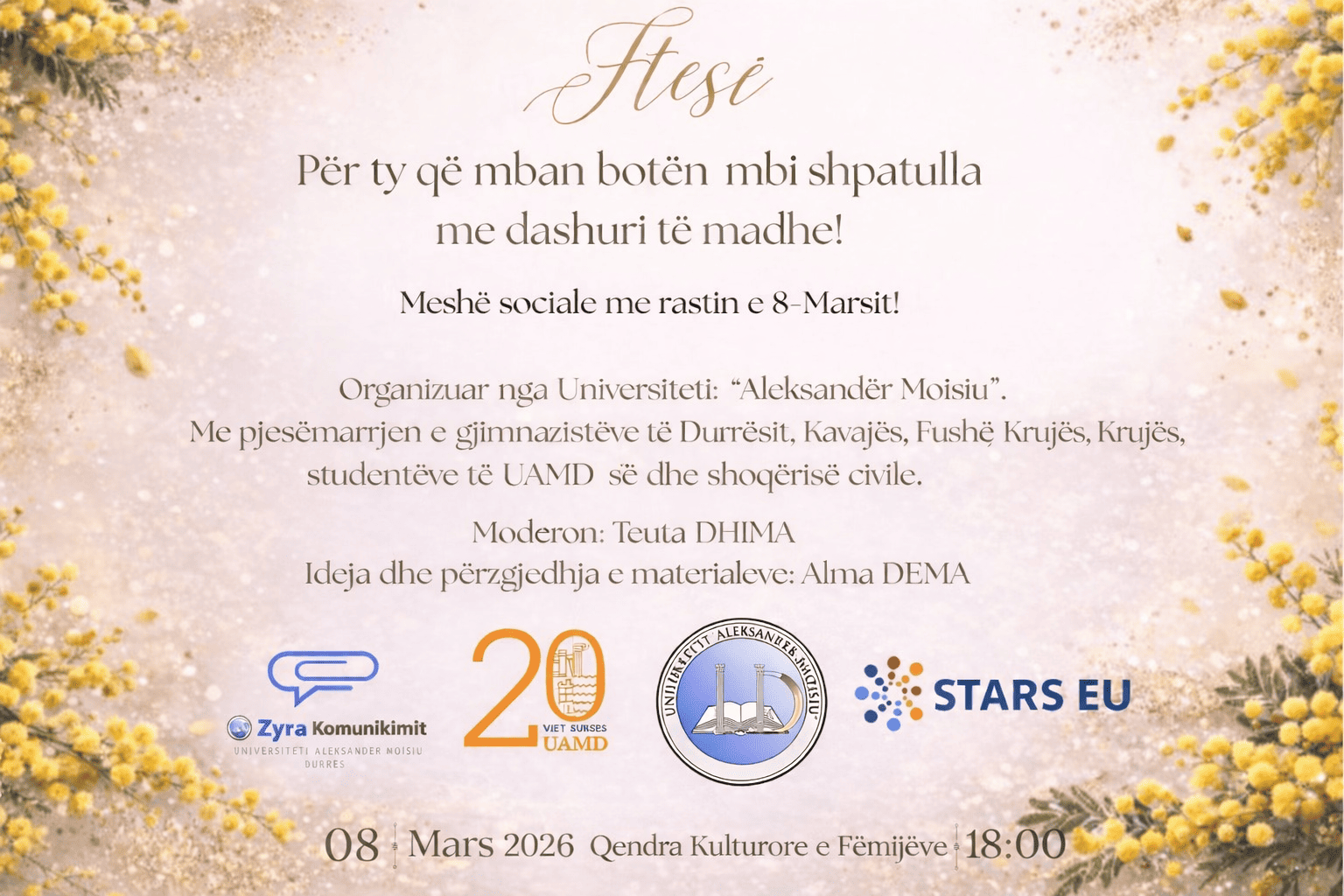 On the occasion of International Women’s Day, the University “Aleksandër Moisiu” of Durrës (UAMD) has organized a social and awareness initiative dedicated to celebrating and recognizing the role of women in society. The main activity is a social discussion titled “Ftesë – Për ty që mban botën mbi shpatulla me dashuri të madhe!” (Invitation – For you who carry the world on your shoulders with such big love), which will take place on 8 March 2026 at 18:00 at the Cultural Center in Durrës. The event brings together high school students from Durrës, Kavajë, Fushë Krujë and Krujë, as well as UAMD students and representatives from civil society.